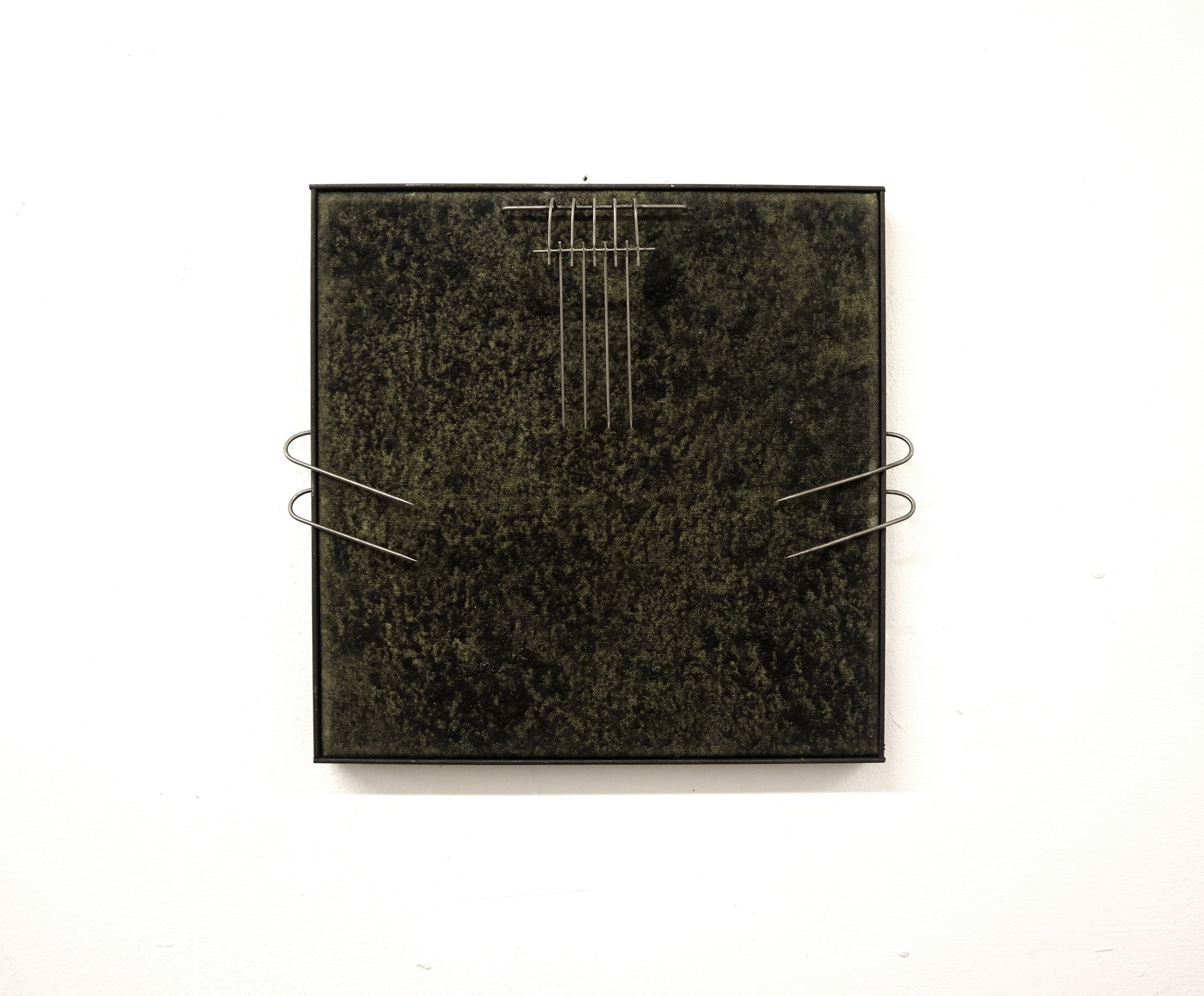 Employing natural materials on canvas, Edoardo crafts textures that echo his fascination with geostructure formation. Interwoven into the canvas are metallic interventions that confront hostile architecture and delve into the realm of violent urban interventions.